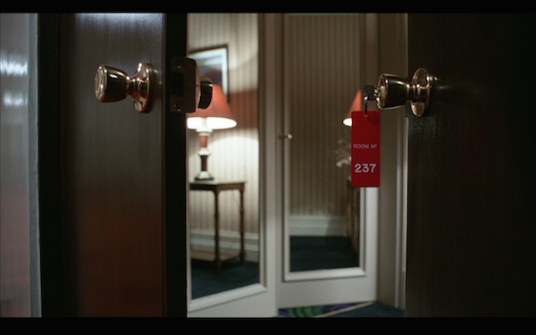 The camera changes to Danny’s point of view as he walks, moving from side to side and bobbing up and down. We see the open room door, the dangling room key and we head straight for it. The eerie music continues, constantly warning us that we are heading for something unpleasant. Danny continues until the room key becomes visible. This is the ill-fated room 237, the same room that Dick Hollorann warned him not to go near. The doorknob with the blood-red key ring is at eye level with Danny and the camera, still in first-person view. Danny stops for a moment in front of the room key and calls again for his mother, this time asking if she is in the room. By addressing her again, he reminds us that her absence is irresponsible.