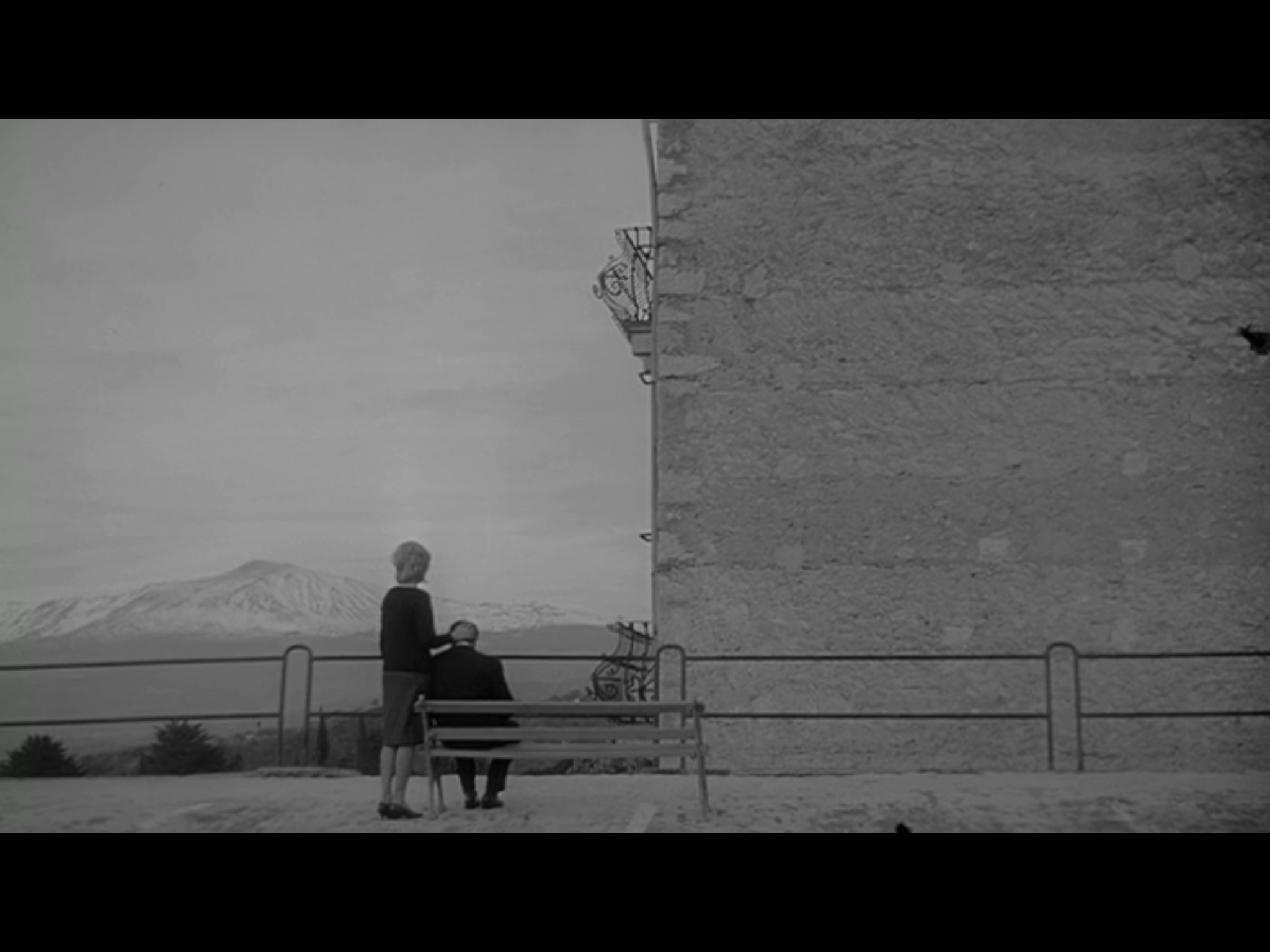 Claudia (Monica Vitti) and Sandro (Gabriele Ferzetti) may be earnestly seeking out and following clues to find Anna’s whereabouts, but as time goes on, they seem less interested in discovering the missing friend and lover. It becomes more about them and their growing relationship. Towards the end, Claudia reveals that she no longer really wants to find Anna, that her old friend’s return would ruin how the situation has evolved. Compared with the resolute Anna, Claudia is needy and confused. She practically begs Sandro to confess his love for her, which he does non-committedly.