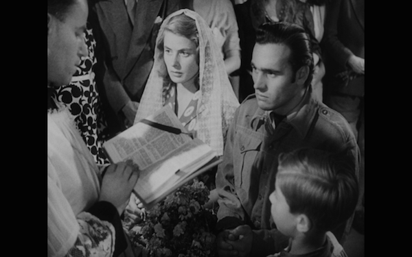 Bergman plays Karen, who we initially meet in a prisoner camp. One of the first actions she takes is to marry an Italian in order to escape the camp. Was this a marriage borne of love? Quite the contrary. It was a marriage for self-preservation and survival. In the wedding scene, the sense of apprehension is clear. Even in the above image, we can see the husband looking stern, and the wife looking distracted by her thoughts, looking off to the side. She is not marrying out of love and is nervous of this new direction in her life, but it is something that has to be done in order for her to persevere.