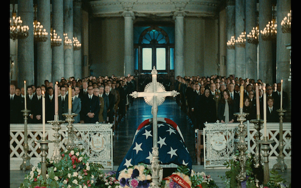 I am about to reveal a major plot point, but not to worry. It is not a spoiler, at least unless you consider the beginning of Sunset Blvd a spoiler. Our operative friend, Mr. Santore dies at the beginning of the film in Montevideo, Uruguay. The film begins with a shot of a shiny Cadillac followed by a series of roadblocks and an exhaustive search by the authorities. We do not know what they are searching for initially, but minutes later when they discover a carcass in a car, we know. Soon after the discovery, we see a highly ceremonial funeral, with an American flag draped over the casket. We get the impression that something is awry because the archbishop and academics are not present, yet the funeral is well attended, implying that this was the passing of an important, political person.